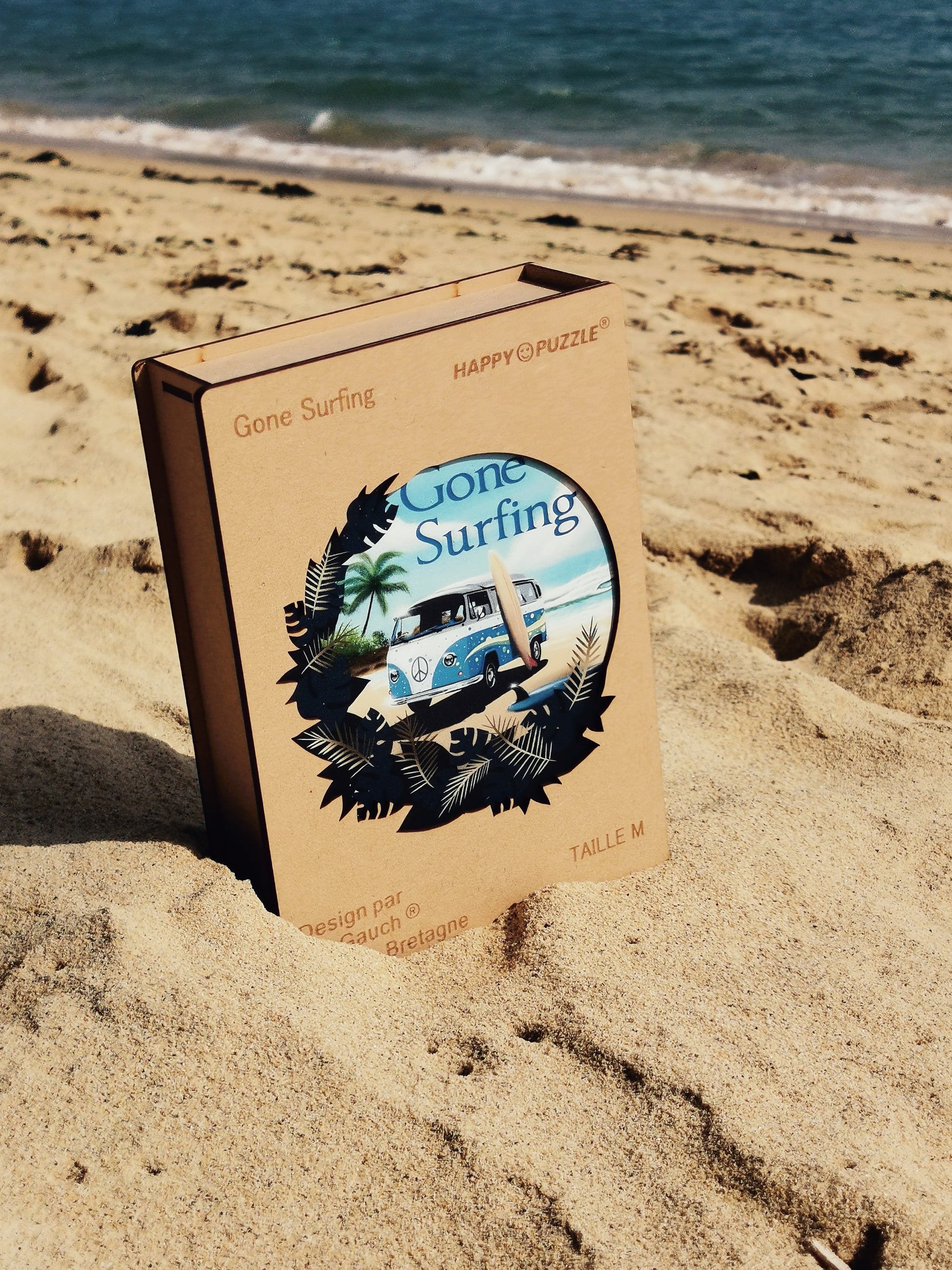 Puzzle bois Gone Surfing Happy Puzzle par RIV GAUCH. Quand le swell se fait désirer, quand on a envie de se vider la tête, passer un moment sympa à deux, rien de mieux que de se poser tranquillement sur la plage ou la dune ou encore dans tranquillement dans le salon et profiter de son temps libre pour réussir à faire ce puzzle en bois assez complexe! Fini, il en devient un objet de décoration qui peut faire office de dessous de plats et qui sur une porte prévient même que vous êtes parti surfer !